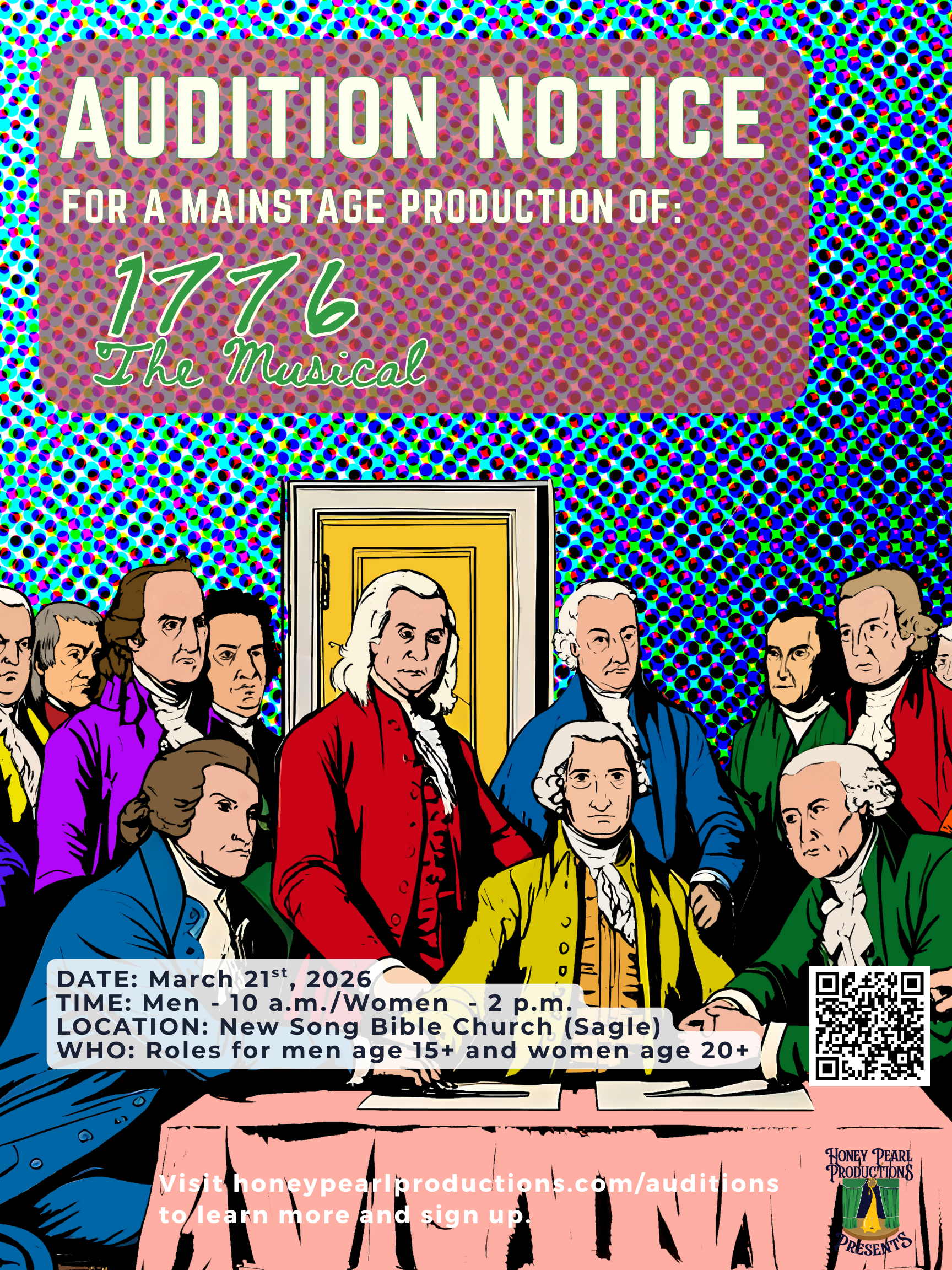 Celebrate America’s 250th anniversary with 1776, the bold and witty Broadway hit that brings the Founding Fathers to life as real, passionate, imperfect people fighting for independence. Set in the summer of 1776, this powerful musical follows John Adams, Benjamin Franklin, and Thomas Jefferson as they struggle to unite the Continental Congress and change history. Audition sign-ups are open — no prepared song required, and all experience levels welcome.